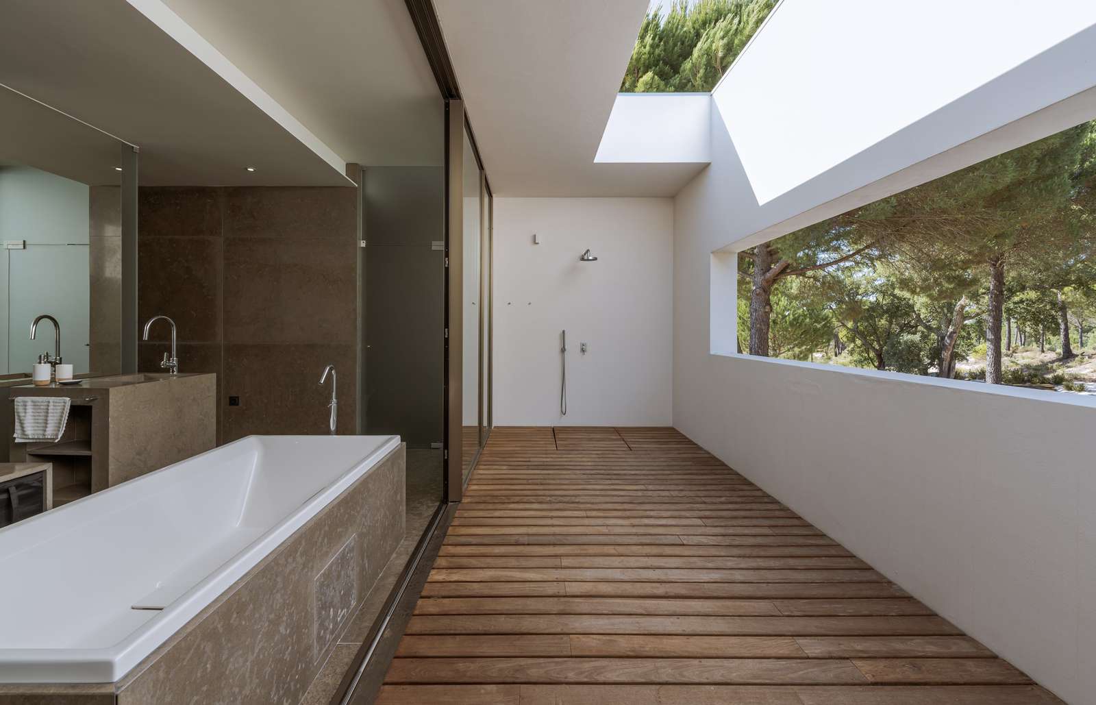 Alma da Comporta features 4 en-suite bedrooms and a separate apartment, perfect for guests traveling with private staff or teenagers seeking independence. The deluxe master bedroom on the first floor has a large private terrace overlooking the infinity pool and a spacious bathroom with panoramic windows offering views of the surrounding countryside. All other bedrooms and the apartment have their own private outdoor sitting areas.