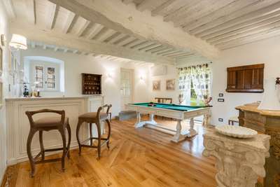 Inside the main residence, the ground floor is composed of a wicker-furnished veranda and an entertainment room with satellite television. The formal dining room, characterized by a monochrome palette and a classic fireplace, opens directly onto the gardens through French doors. A professional-grade kitchen and a billiard room with a private bar provide dedicated spaces for hosting and leisure.