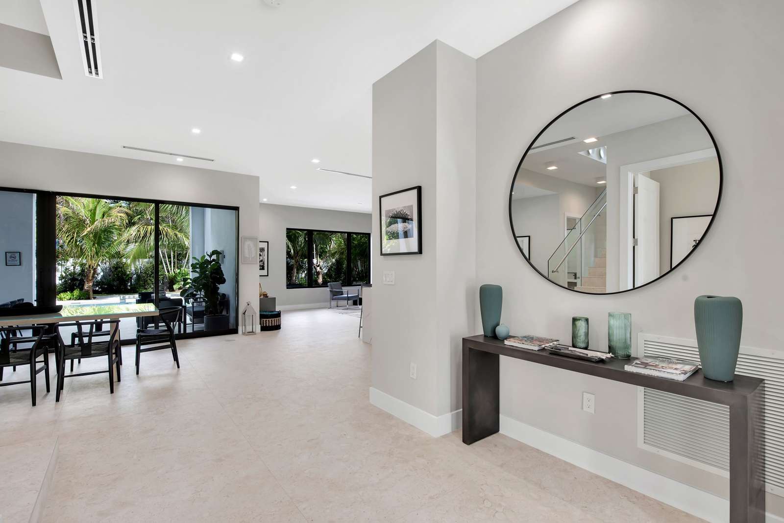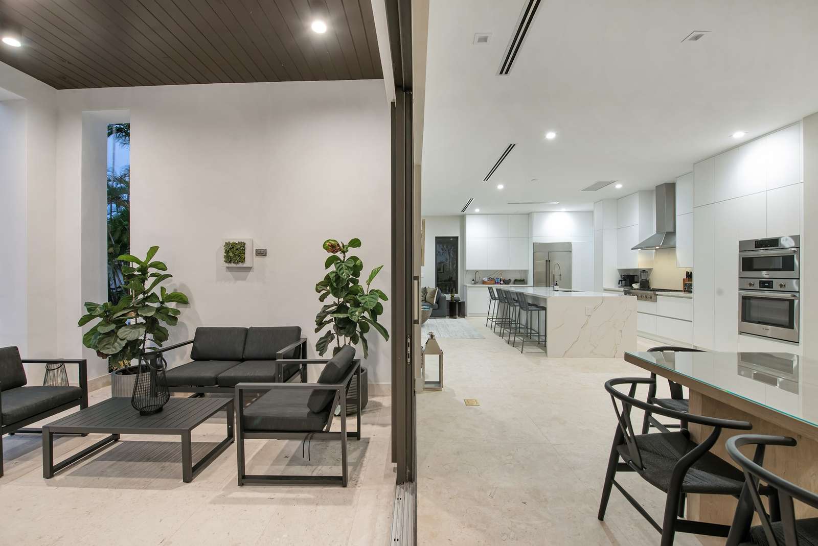 The villa features large glass walls, seamlessly blending the interior with the stunning exterior spaces, which include covered terraces for lounging and dining. The open, light-filled living spaces feature wood plank floors and limestone tiles throughout. The kitchen is a chef's dream, with custom cabinets, a 12-foot kitchen island with quartz countertops and a waterfall finish, high-end stainless steel appliances, a built-in microwave and oven combo, a cooktop, a wall hood, a dishwasher, and a wine cooler.